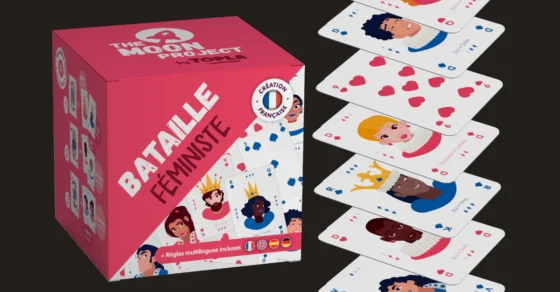 « Bataille Féministe » est un jeu de 52 cartes classique mais pas si classique. Le trio classique « Roi, Dame, Valet » a évolué ! La Dame est remplacée par la Reine, qui a le même pouvoir que le Roi. Ducs et Duchesses sont créés et ont la même valeur et les Valets sont remplacés par Vicomtes et Vicomtesses. Un petit twist qui change tout pour l’égalité des chances dans l’égalité des genres et une façon de lutter contre les stéréotypes !